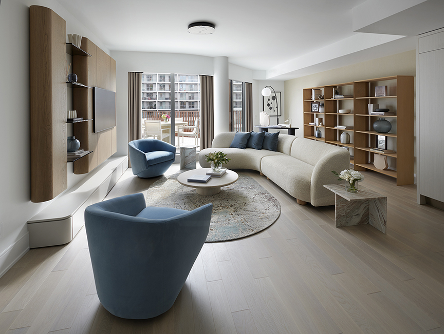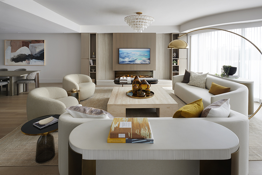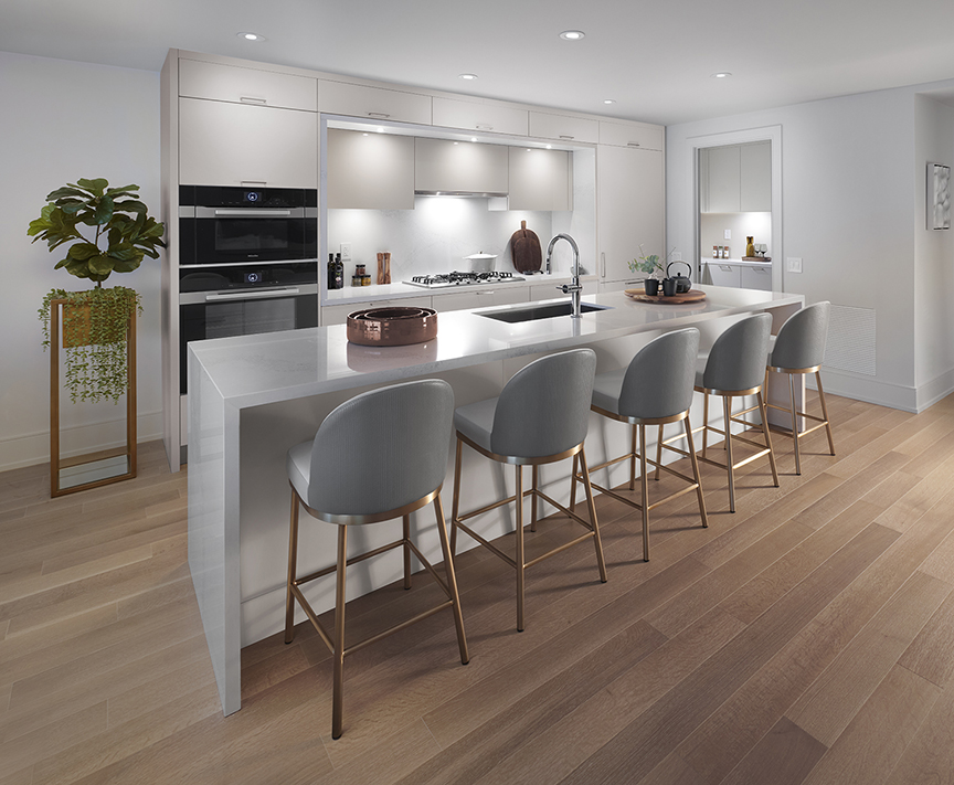 Aqualuna’s interiors, designed by II BY IV DESIGN, also reflect a deep commitment to refinement, where sculpturally scalloped architecture is echoed through soft curves, custom millwork and a tactile, light-filled palette. Every detail emulates a quietly luxurious, intentionally crafted experience that balances beauty, livability and environmental responsibility. “Our first three phases were successful in creating an established waterfront community, and this one [Aqualuna] really took it up another notch,” explains Fung, emphasizing how these thoughtful architectural elements will stand the test of time.