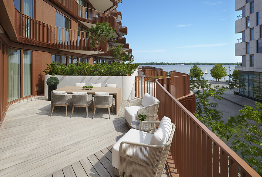 Fung notes that leading architectural firms participated in an international design competition, marking a deliberate effort to incorporate diverse perspectives in the selection of an architect. In a fusion of global talent and local partnerships, two local firms and two international firms were tasked with creating designs that maximized water views while integrating as much outdoor terrace space as possible. “Collaborating with Danish architecture firm 3XN brought forward a fresh, unique design and colour palette,” Fung says. “Working with Waterfront Toronto also helped the whole vision come together, allowing it to feel fully supported.”